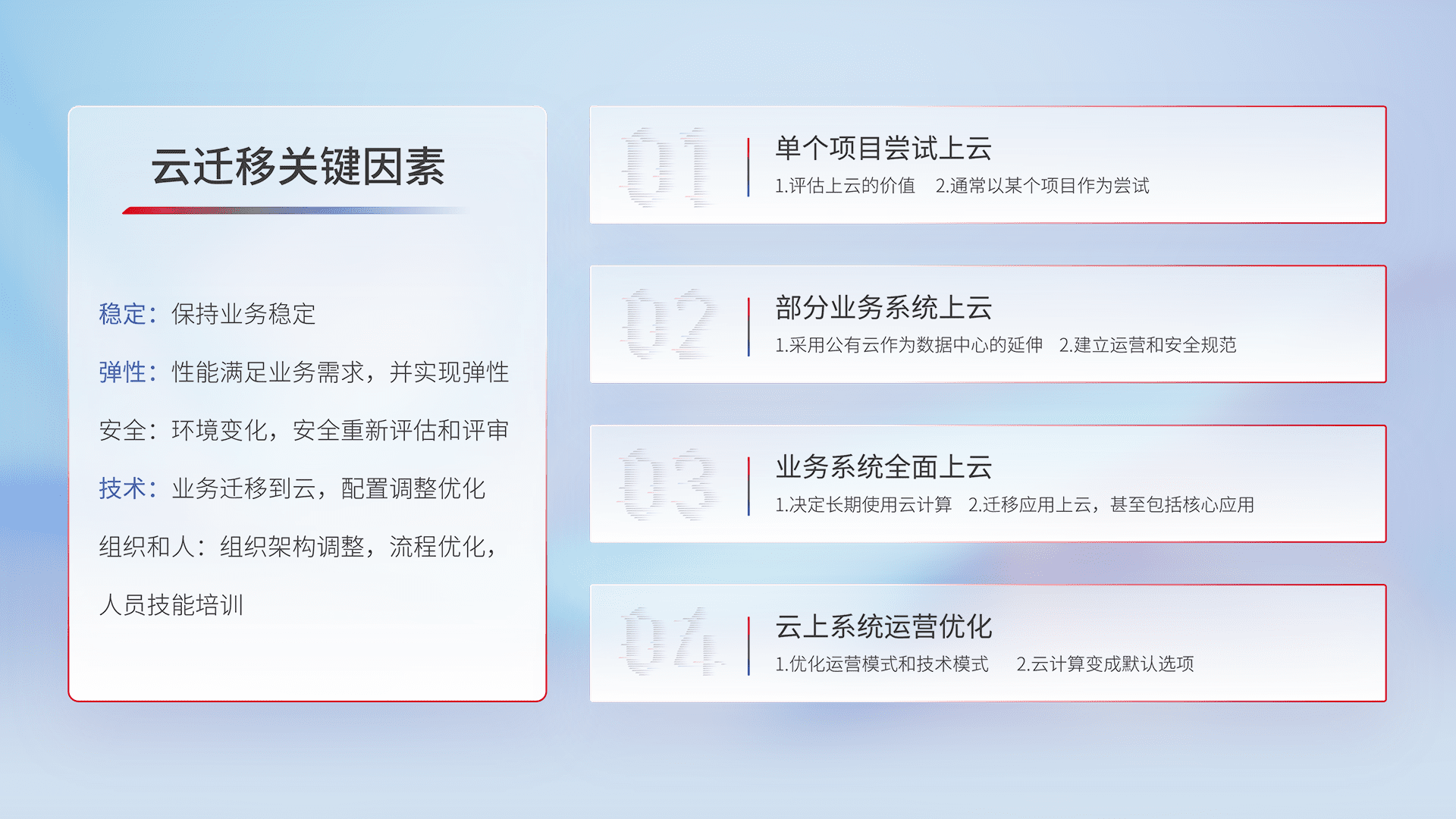结合实际业务,,,从规划设计、、、、云平台选型、、、云原生改造、、、数据迁移、、、集成交付,,,迁移全过程为客户识别最佳上云路径,,,做好风险识别管理,,,,设计网络架构、、、、身份权限、、、、安全审计合规、、、操作审计、、、日志审计、、、、监控告警策略、、多站点容灾设计等,,对云上基础设施进行整体规划,,,,提升IT治理水平,,以满足弹性、、高可用、、、、高性能的需求。。。