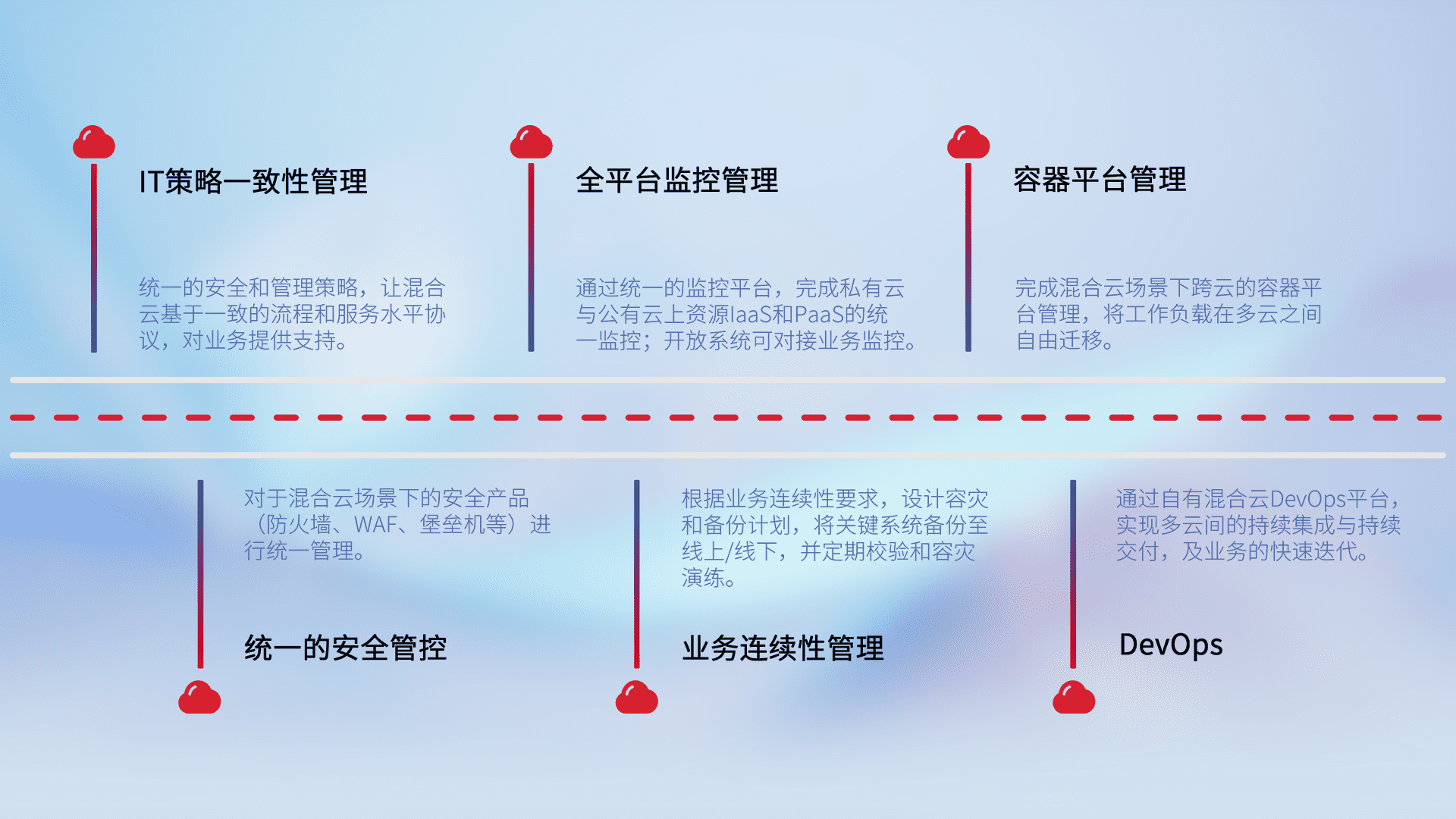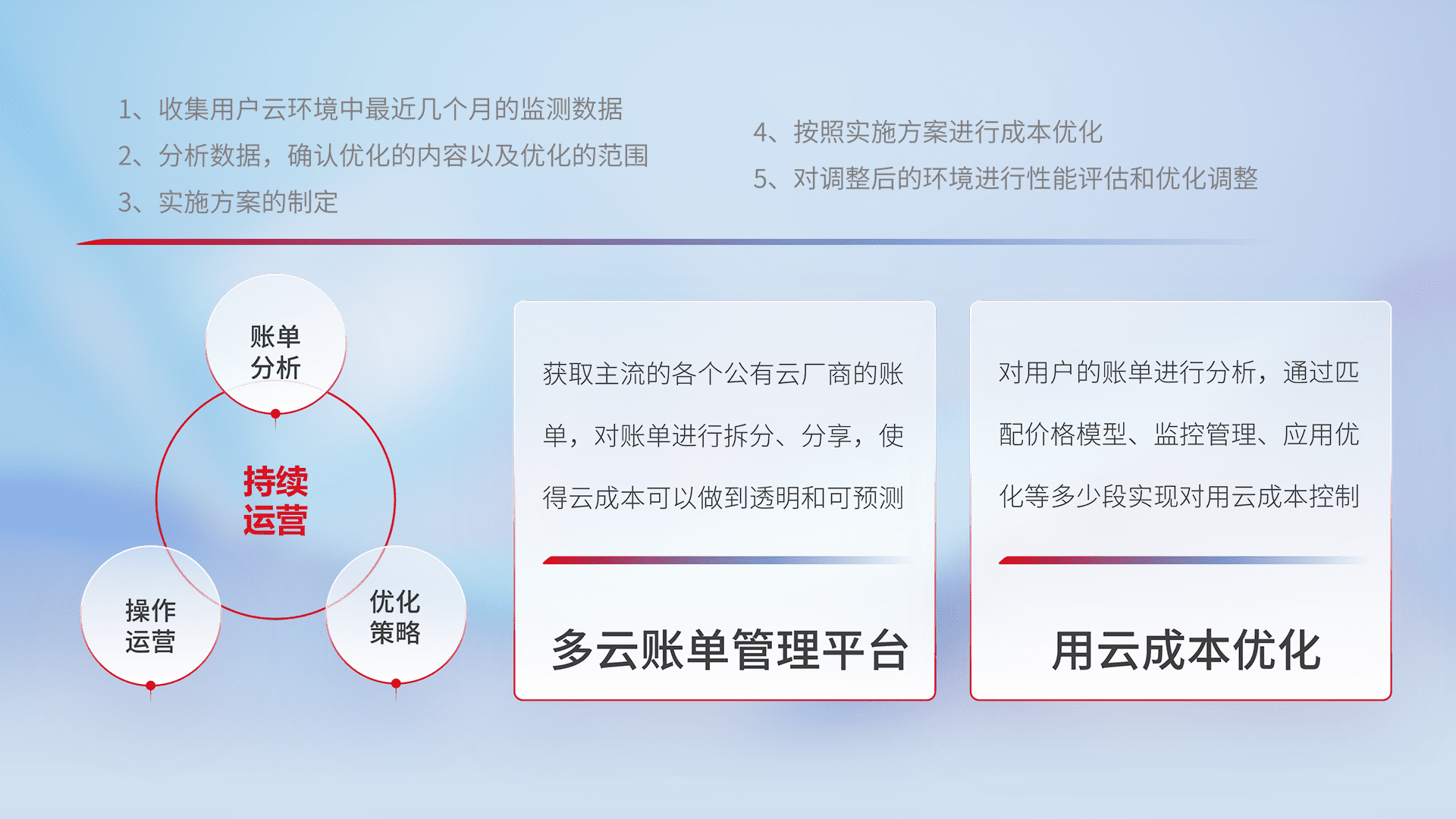 通过多云纳管,,以统一的资源数据模型把客户的云资源进行抽象和封装,,,,进而实现对多云资源的统一操作,,,,保障云资源管理的可靠性、、稳定性与可用性。。量身定制化运维内容,,,,配置、、开发运维、、、补丁管理、、、、备份、、、、监控、、、认证和访问管理、、、、审计和日常巡检等,,,,保障在用云过程中的可靠度,,,,稳定度以及高可用率。。。