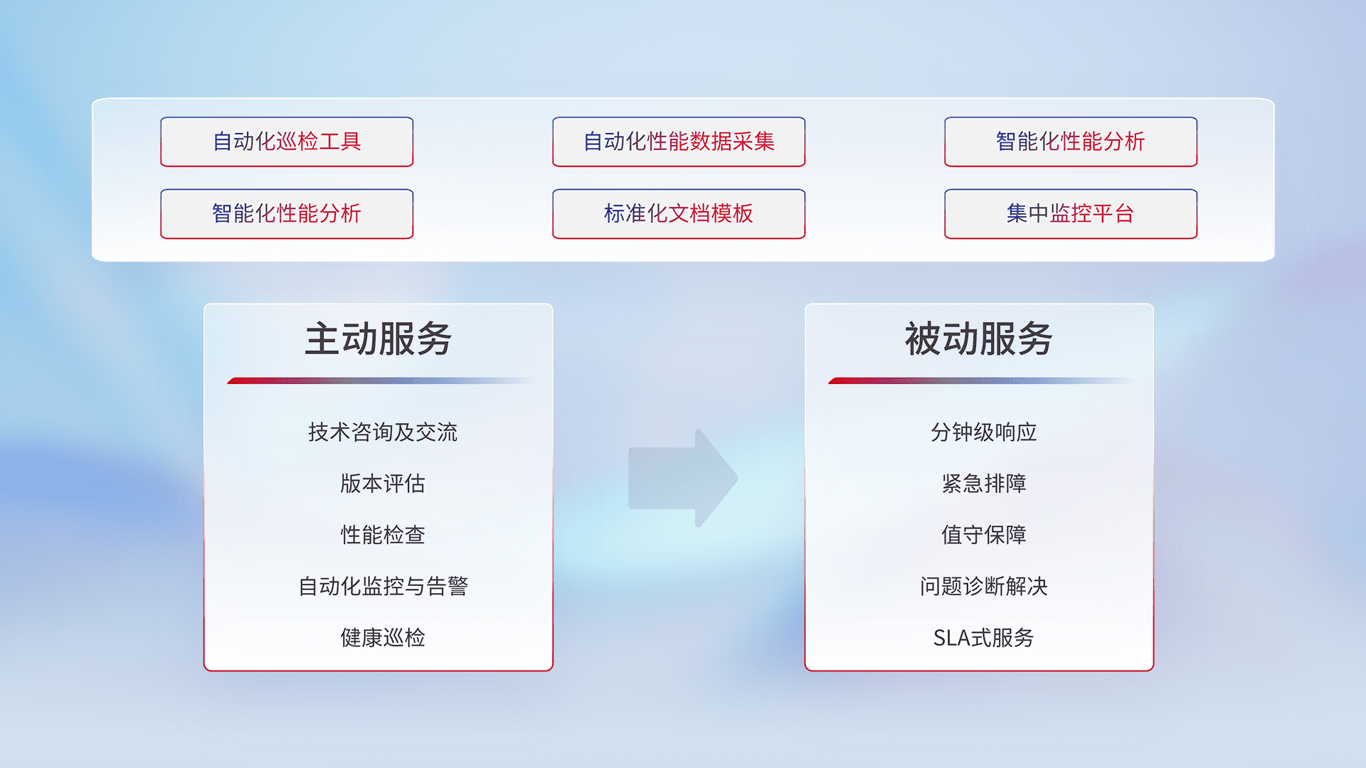 智能化工具和标准化文档,,,,保障服务质量,,,提供主动服务(包含技术咨询、、、版本评估、、、性能检查、、、自动化监控与告警、、、健康巡检)和被动服务包含(分钟级响应、、、紧急排障、、、、值守保障、、问题诊断解决、、、、SLA服务)。。。。
